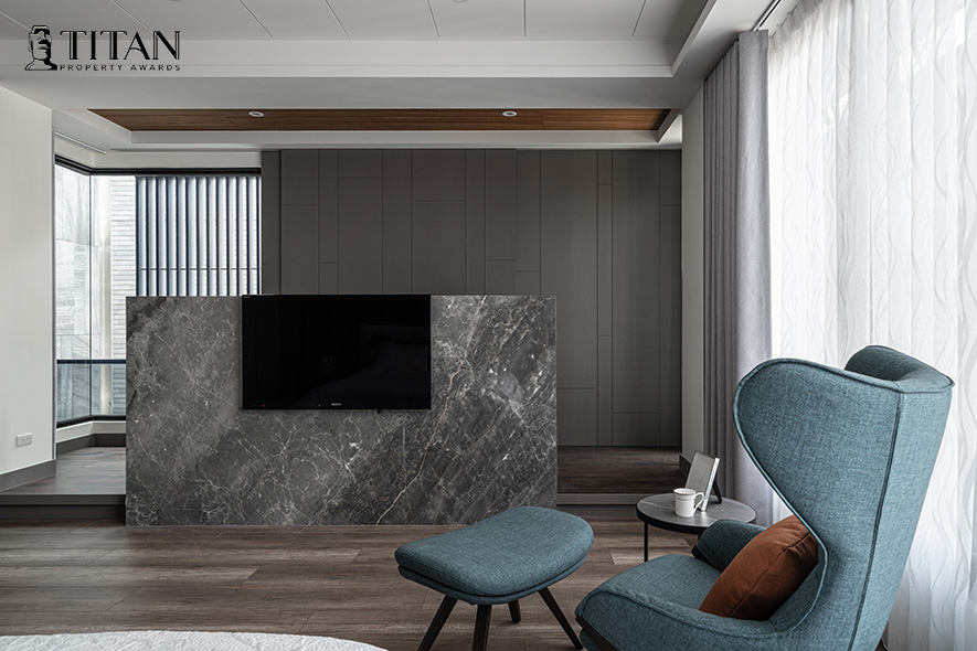 詠絮室內設計 以形構區域的獨特性為設計核心,公領域巧搭大理石材和業主鍾情的灰、藍色,呈遞大氣富麗的氣派感,私領域則依居者喜好,勾勒風格各異的專屬空間,簡雅迷人的宅邸《寧奢靜界》榮獲2023 TITAN Property Awards金獎,新添品牌榮譽!